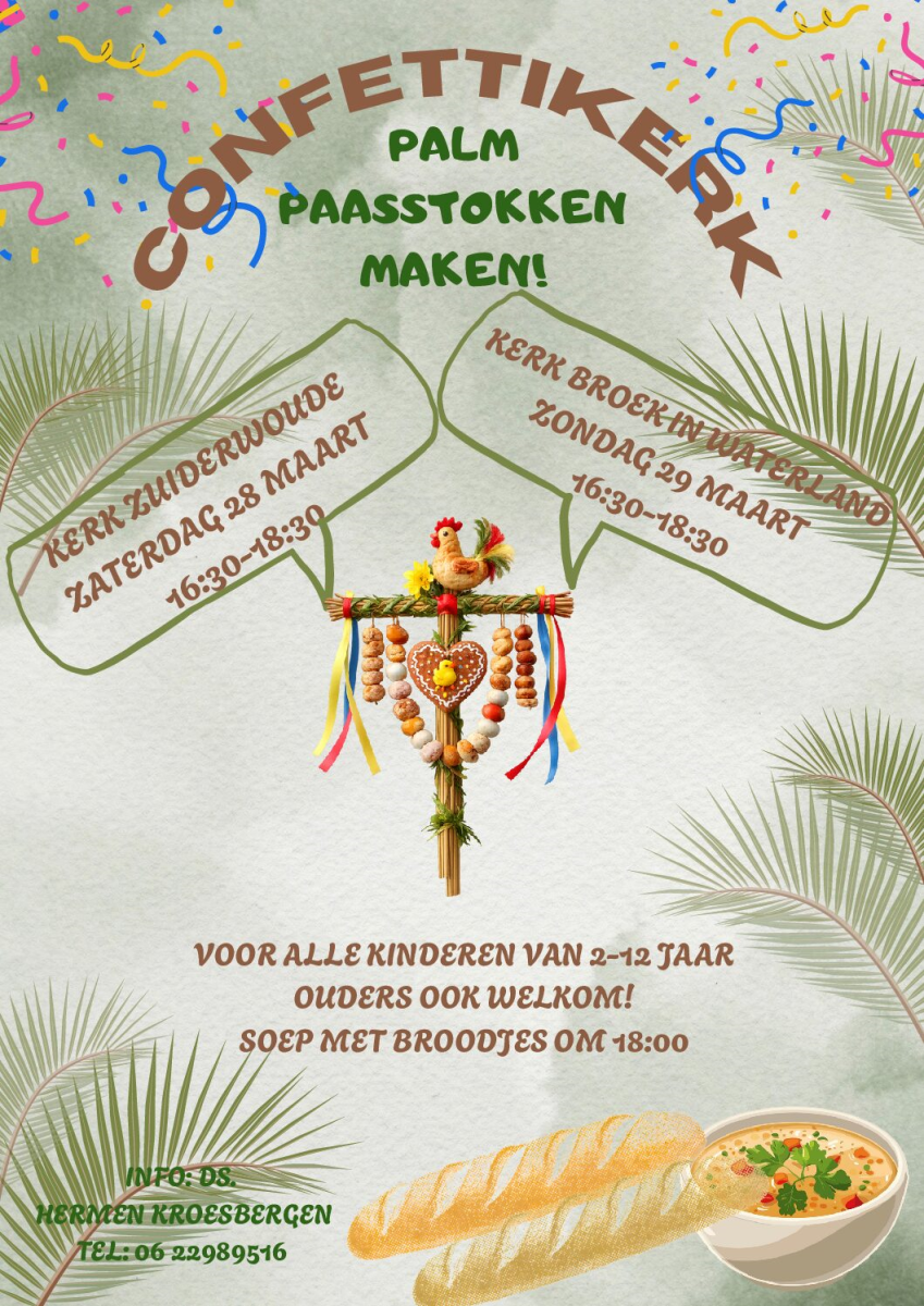![]() Op zaterdag 28 maart om 16.30 uur in Zuiderwoude en op zondag 29 maart om 16.30 uur in de Broek in Waterland gaan we Palmpasenstokken maken. Geef het door en schrijf het vast op de kalender! | ||